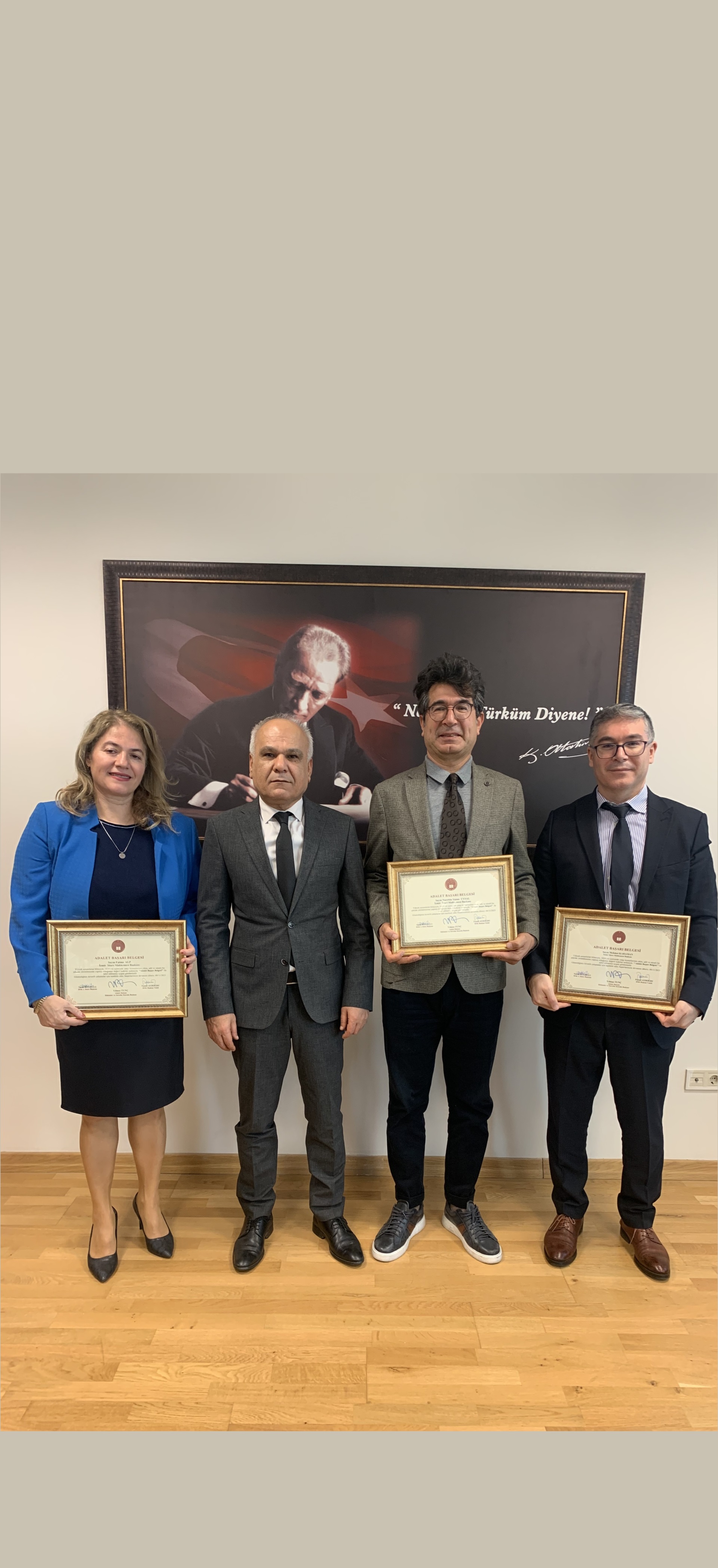 Hakimler ve Savcılar Kurulu Yargı Etkinliği Bürosunca, 2024 yılı iş ve kadro durumu esas alınarak yapılan değerlendirmeler sonucunda performans puanına göre kendi bölge ve biriminde dereceye giren Mahkeme Başkanlarımız Sn. Fatma ALP, Sn. Nurettin Yunus UYSAL ve Sn. Mehmet KARAMAN’ a “Adalet Başarı Belgesi“ ile Adalet Bakanımız Sayın Yılmaz TUNÇ tarafından hazırlatılan hediyeleri komisyonumuzca takdim edilmiş olup, Başkanlarımızı tebrik ediyor, başarılarının devamını diliyoruz.